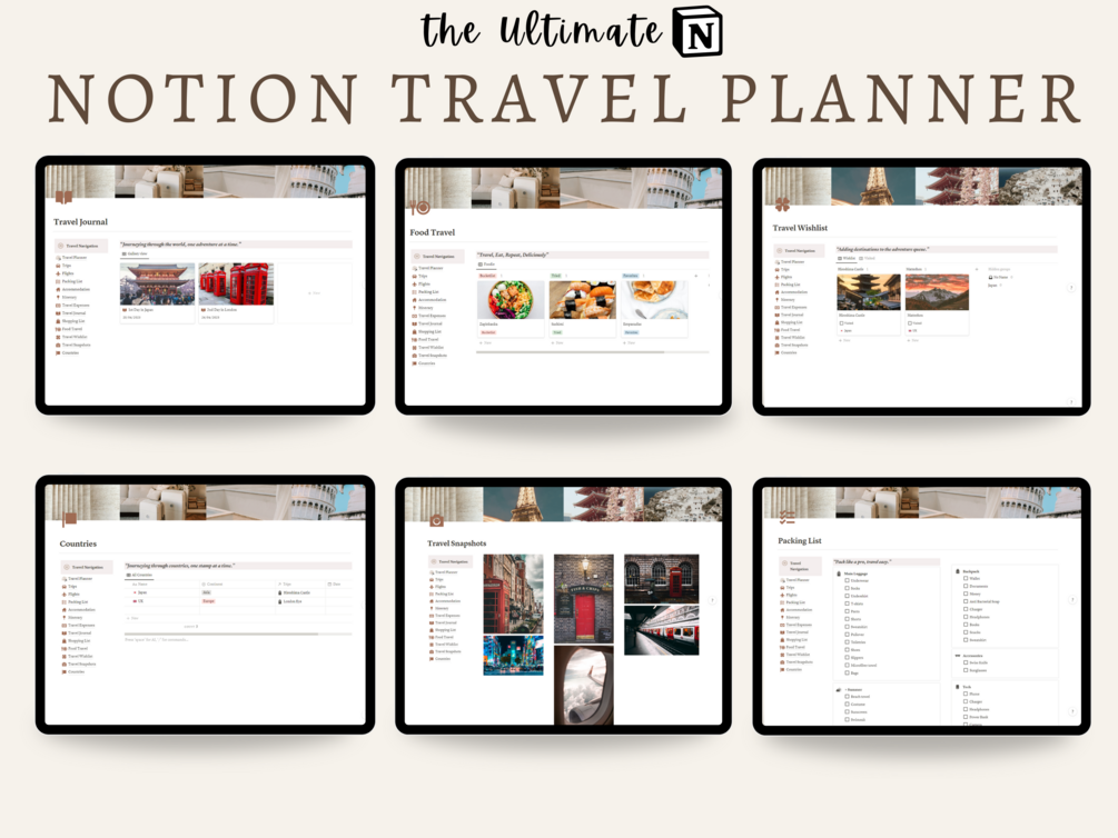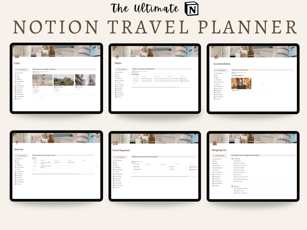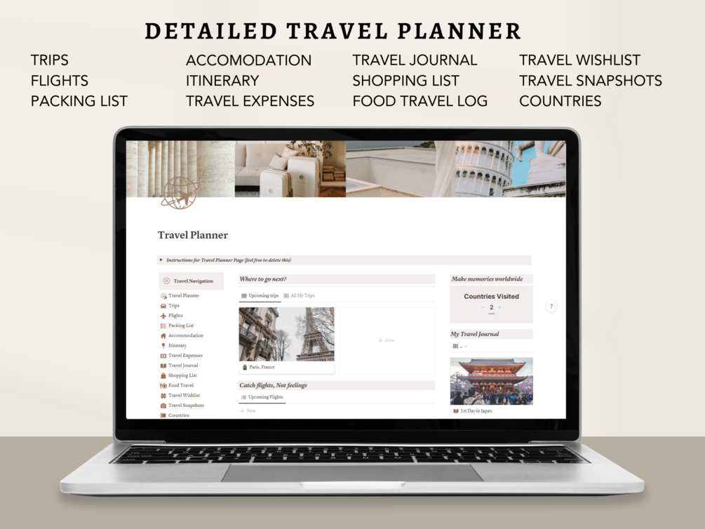 Effortlessly elevate your travel experiences with our comprehensive Notion Travel Template. Seamlessly organize trips, flights, accommodations, expenses, and memories, all while adding your unique style to every adventure.