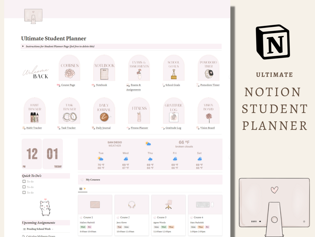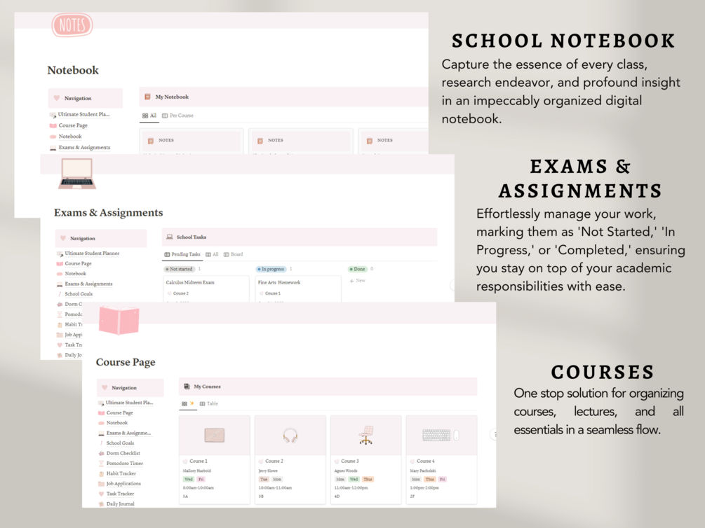 Elevate your college journey with our exceptional Student Notion Template. Seamlessly manage your courses, notes, goals, wellness, and more, ensuring a smooth and productive academic experience.